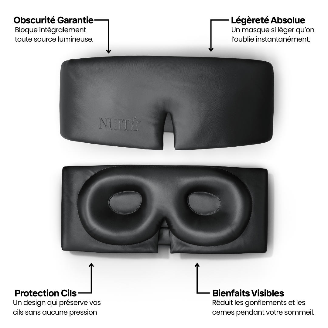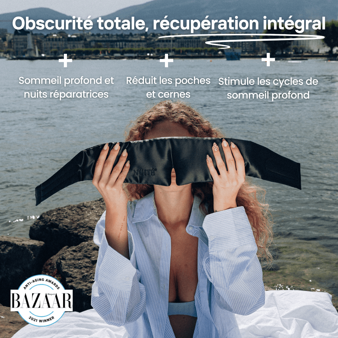 Le masque de sommeil NUITÉ® favorise un endormissement plus rapide et un sommeil plus profond, indispensable à la régénération physique, mentale et cutanée.